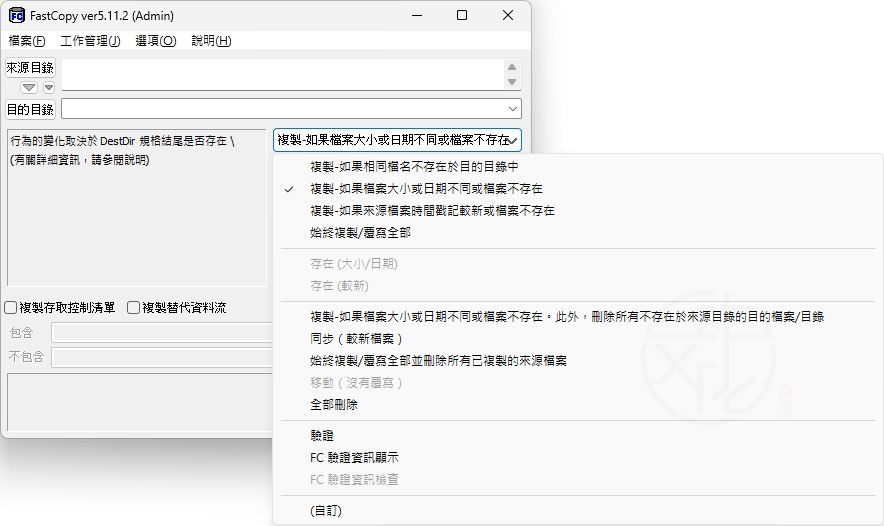 複製-如果檔案大小或日期不同或檔案不存在(Diff(Size/Date)):檔案大小或日期不同才重新複製。